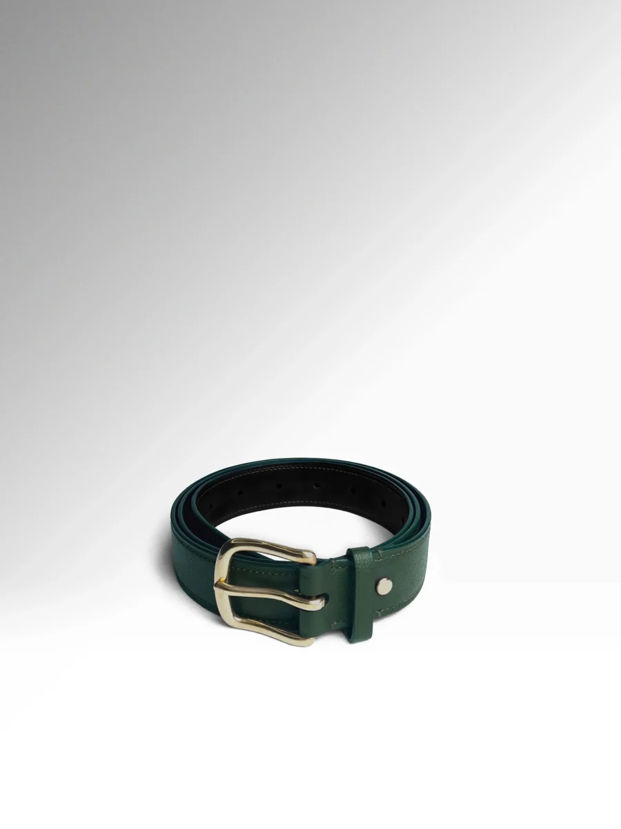 The Eris Leather Belt by Jaco Atelier combines rich dark green Epsom leather with durable vegetable tanned butts leather for a refined, comfortable fit. Its solid brass buckle and polished edge paint add an elegant touch, whether paired with formal or casual attire. Every detail speaks to exceptional craftsmanship, making this belt a timeless addition to any wardrobe.