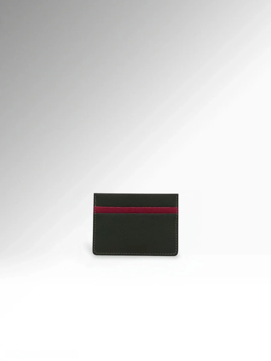 Vector is a luxury leather card holder crafted from full-grain French Epsom leather, defined by clean lines, precision, and refined craftsmanship. The rich dark green exterior is elevated by a subtle burgundy accent, creating a sophisticated contrast that enhances its minimalist aesthetic.